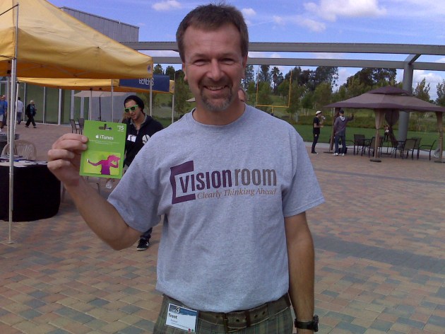 A an early adopter displays his Vision Room swag.